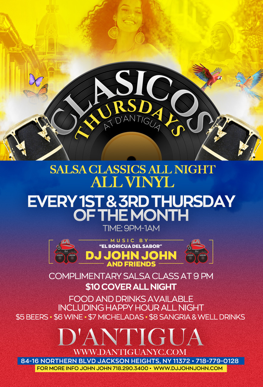 I would like to cordially invite you to CLASICOS THURSDAYS at the legendary D’Antigua at 84-16 Northern Blvd in Jackson Heights/Queens every 1st & 3rd Thursday of the month as we feature the best in salsa classics in vinyl from the best DJ’s around including your host “El Boricua del Sabor” DJ John John.