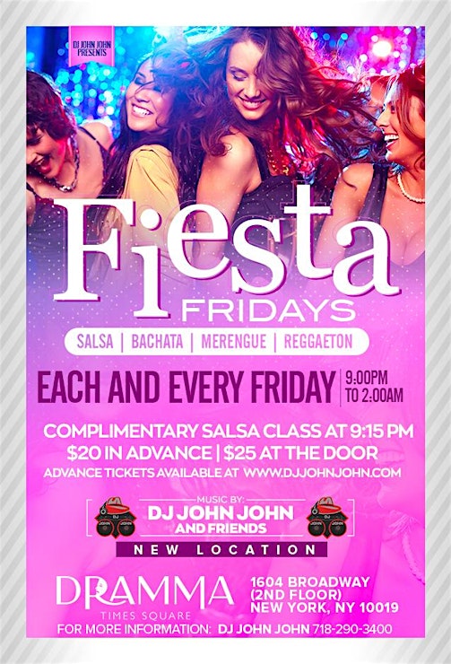 FIESTA FRIDAYS is coming to the bright lights of Times Square  at DRAMMA NIGHT CLUB featuring Salsa, Bachata & More.