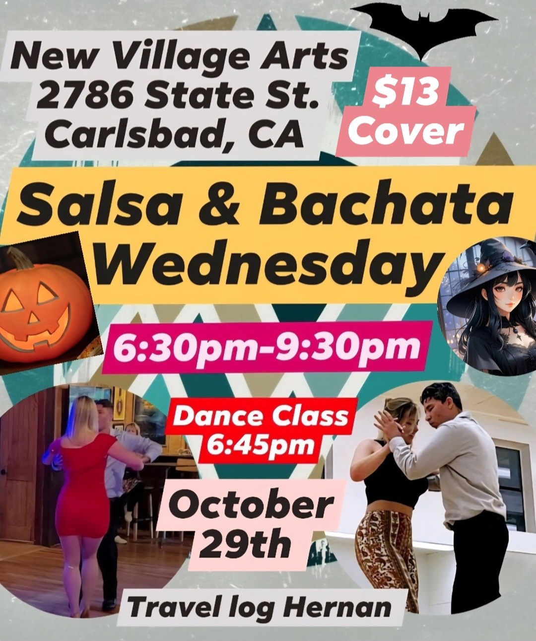 Halloween ๐ ๐ป Custume Salsa & Bachata Dance Party in Carlsbad Village. Get your Tickets ๐ today online. Click direct link https://newvillagearts.org/event/salsa-bachata-dance-party/2025-10-29/ or at the Box Office. $13 dollars. New Village Arts 2787 State St. Carlsbad. (760) 433-3245. 6:30pm to 9:30pm. Dance Class 6:45pm. ๐ง๐งโโ๏ธ๐ง