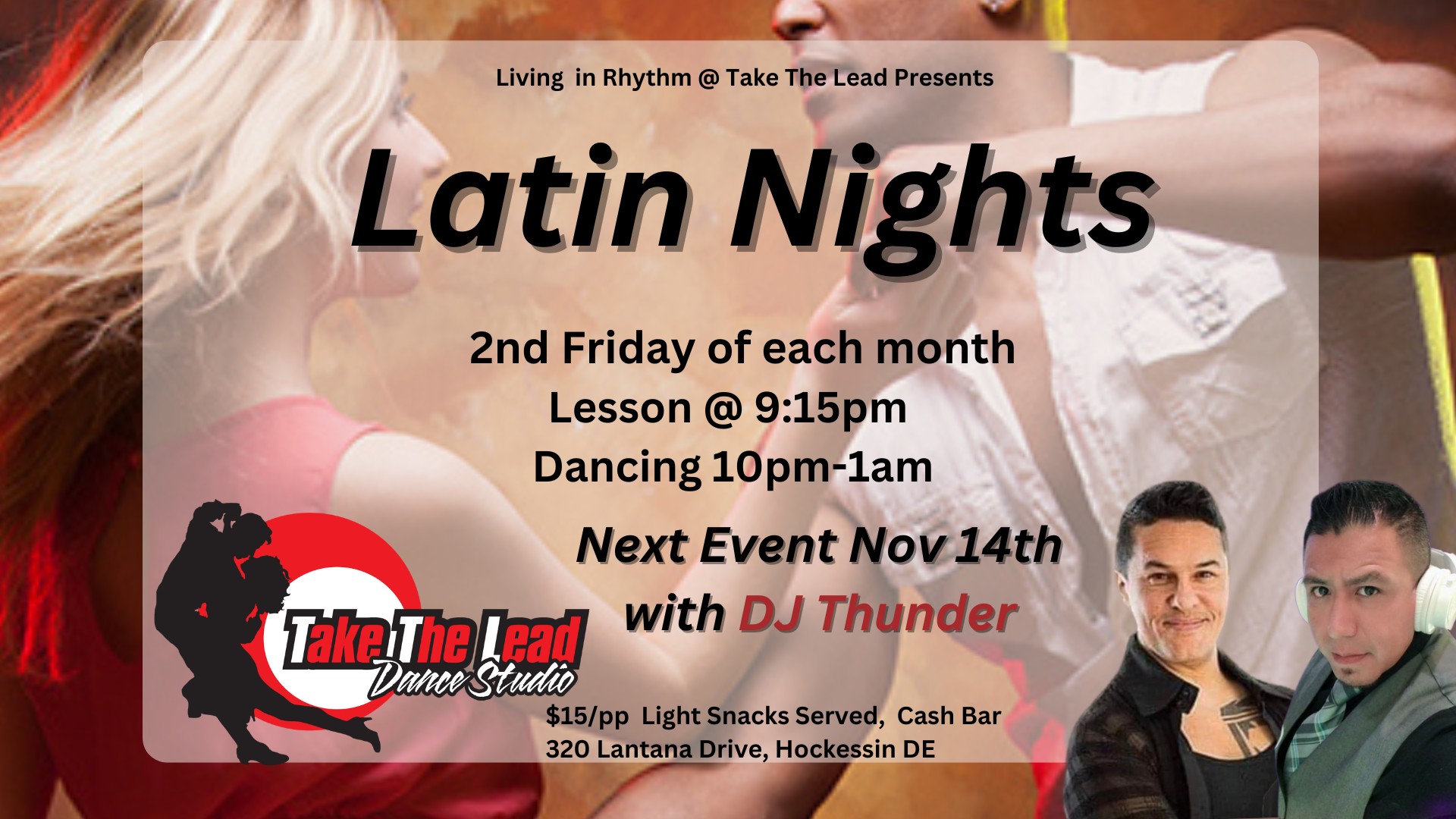 Music includes Salsa, Bachata, Merengue, ChaCha, Cumbia, Kizomba, and more.