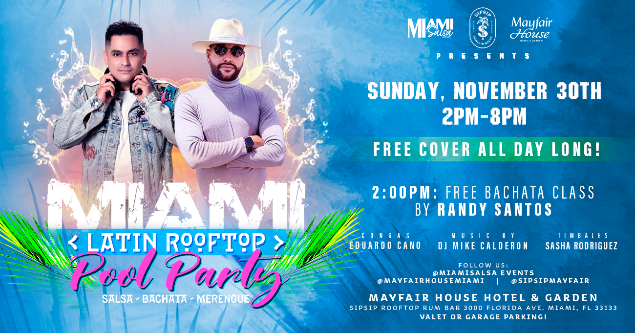 Located at the amazing Mayfair House Hotel & Garden. We are proud to bring back Miami’s original and most fun latin pool party for all! We are super excited to mix Miami vibes and pool party fun under the sun to all dancers and latin music lovers! Get your bikinis and trunks ready for Sunday funday in the heart of Miami at one of the most gorgeous rooftops with breathtaking views. Invite your families and friends and get ready to dance the entire day away with our top notch music team of DJs, dancers, and musicians!
