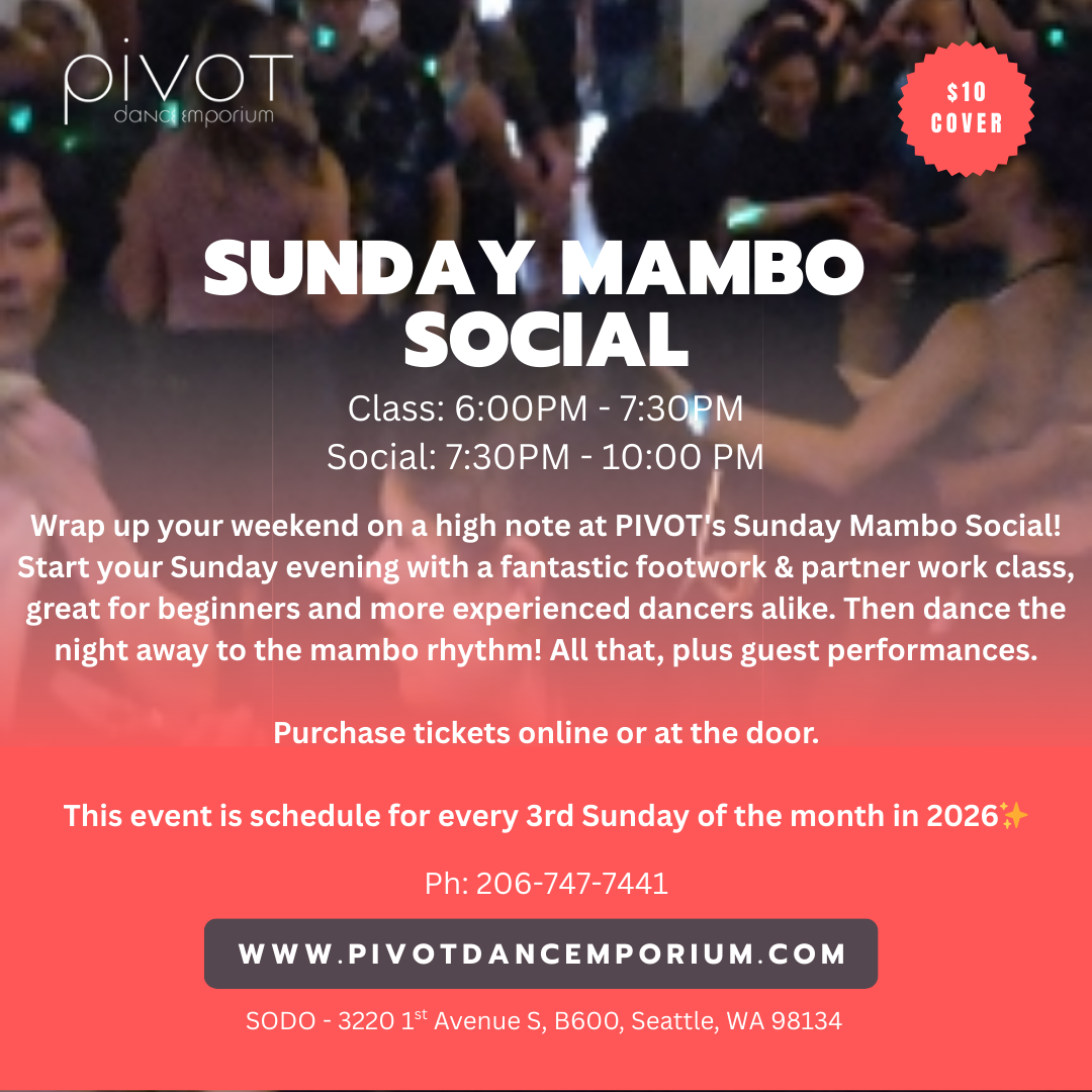 Wrap up your weekend on a high note at PIVOT’s Sunday Mambo Social! Start your Sunday evening with a fantastic footwork & partner work class, great for beginners and more experienced dancers alike. Then dance the night away to the mambo rhythm! All that, plus Solo Ritmo will be debuting their newest routine and we can’t wait to watch them shine!