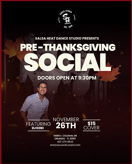 Get ready to kick off Thanksgiving weekend on the dance floor! Our Pre-Thanksgiving Social brings the heat with DJ Koki spinning the best salsa and bachata all night. Come dance, unwind, and enjoy the vibes before the holiday!