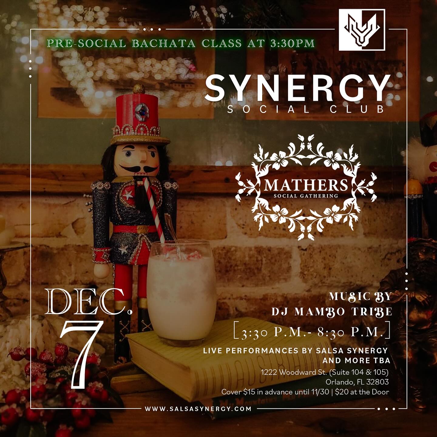 Synergy Social Club cordially invites you to a latin social experience like no other at Mathers Social Gathering in Downtown Orlando!! Mark those calendars – Sunday, December 7th, come ready to indulge in bite to eat, a speak easy drink, and plenty of dances under the beautiful holiday lighting and decor. Behind the library’s murphy door is a vibe that can’t be beat this holiday season, trust us!! Dj Mambo Tribe will be there to provide the right mix of Salsa, Bachata, and Cha-Cha to keep the crowd going! Enjoy a free pre-social class at 3:30pm! Also, for the first time ever we will have a special performance by the Synergy Pro Team!! More artists and special guests TBA!! Stay tuned for more fun details in the coming days.