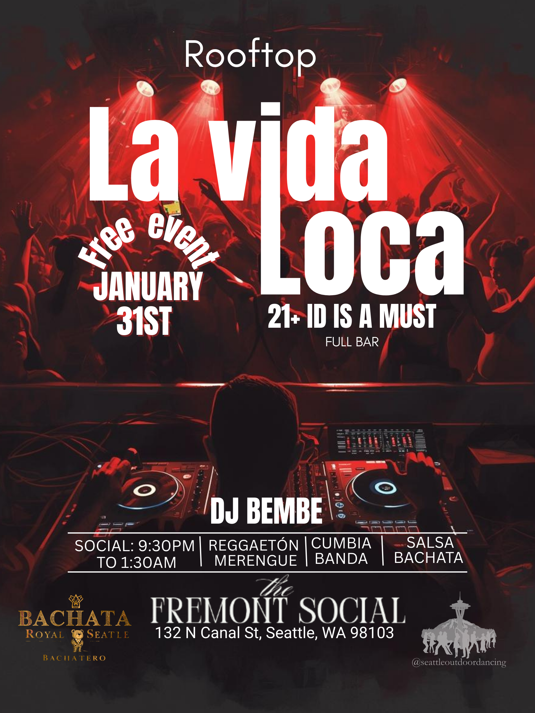 Seattle, we’re going ROOFTOP LATIN La Vida Loca is taking over Fremont! Free event • Full bar • 21+ only 🎧 DJ Bembe 🕤 9:30PM – 1:30AM 💃 Reggaetón | Salsa | Bachata | Cumbia | Merengue | Banda This one’s about energy, music, and dancing all night 💃🕺 See you on the rooftop