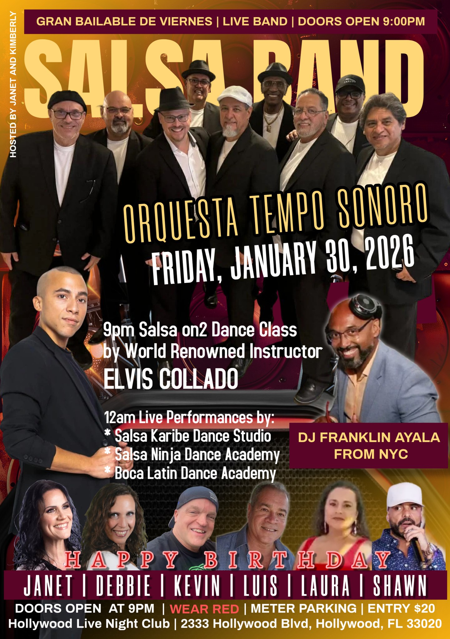 Hollywood Live 2333 Hollywood Blvd, Hollywood, FL, United StatesSAVE THE DATE! January 30, 2026 $20 cover Live Salsa Band: Orquesta Tempo Sonoro DJ Franklin Ayala from NYC 9pm Salsa on2 Class by Elvis Collado 12am Live Performances by: […]