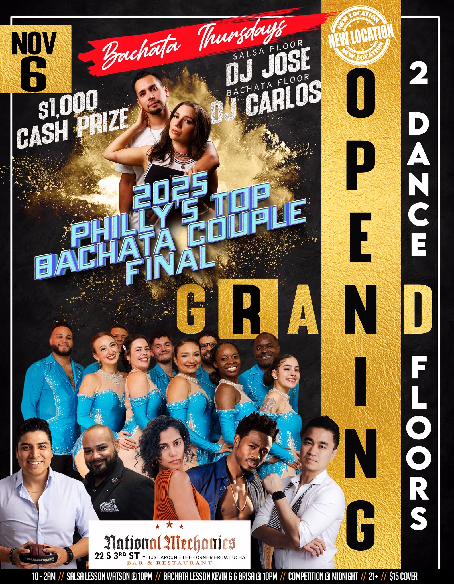 National Mechanics 22 S 3rd St, Philadelphia, PA, USNEW VENUE - 2 DANCE FLOORS - SALSA & BACHATA ***PHILLY'S TOP BACHATA COUPLE 2025 FINAL - $1,000 CASH PRIZES & TROPHIES *** Join us at our new venue, National Mechanics, just around the corner from Lucha. Have fun, bring your loudest supporters, and bribe them with drinks. 🏆 Bachata Lesson at 10pm with Kevin […]