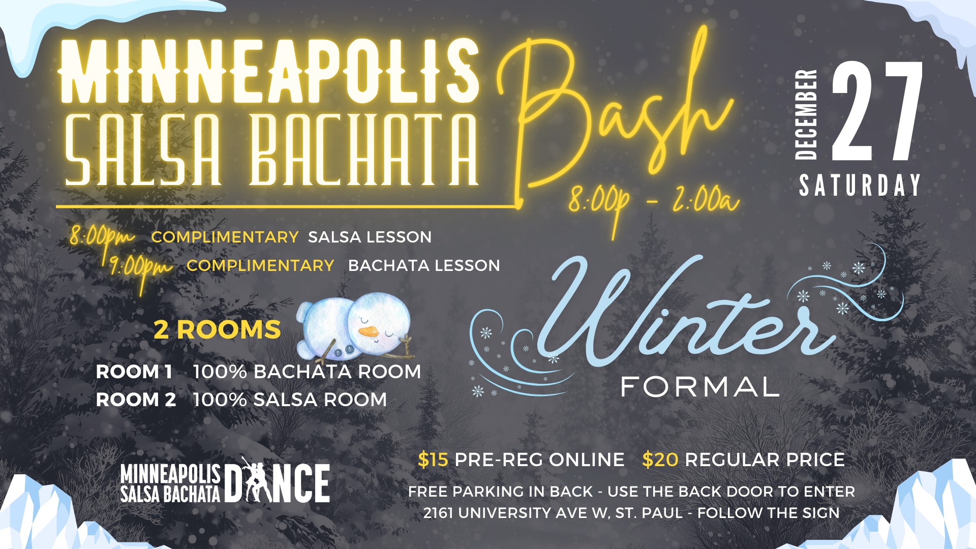 2161 University Ave W #208 2161 University Ave W #208, St. Paul, MN, United States✨ WINTER FORMAL ✨ Theme is the WINTER FORMAL!!! Dress to impress and maybe ask someone to go to the formal with you! 💃🏻 This event is perfect for salsa AND bachata lovers of all levels. Whether you're a seasoned pro or just starting out on the dance floor, you'll have a blast. 𝗖𝗢𝗠𝗣𝗟𝗜𝗠𝗘𝗡𝗧𝗔𝗥𝗬 𝗟𝗘𝗦𝗦𝗢𝗡𝗦 […]