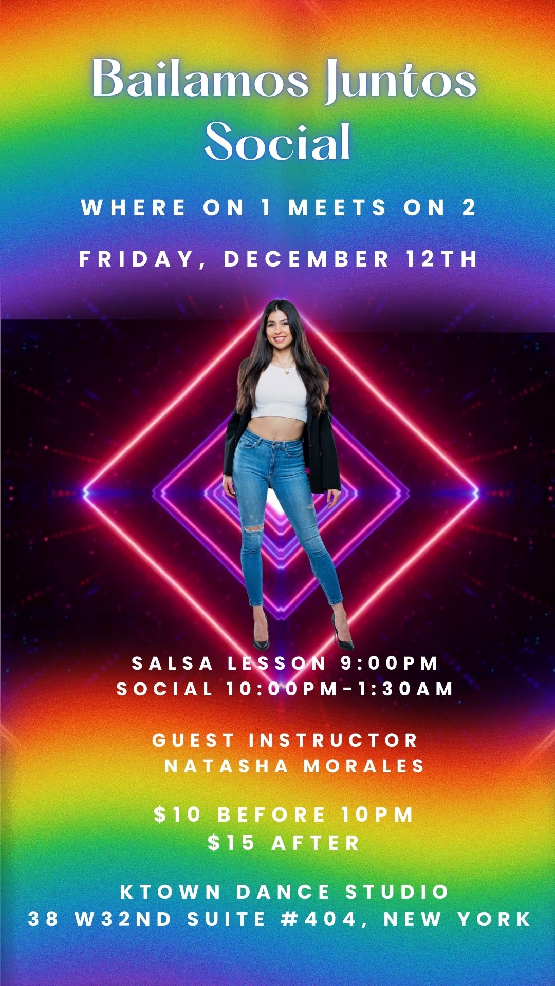 KTown Dance Studio NYC 38w West 32nd Street #Suite 404, New York, NY 10001, New York, NY, United StatesJoin us Friday, December 12th at Bailamos Juntos Social Salsa Caleña Class at 9pm with Natasha Morales Social Dancing 10pm-1:30am Hosted at ktown dance studio 38 W32nd st, Suite #404 See you on the dance floor!